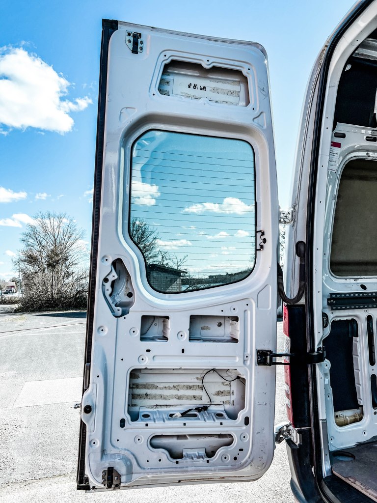 Wir haben den Sprinter mit den üblichen originalen weißen und grauen Plastikverkleidungen an den Hecktüren, erworben. Diese haben wir in einem ersten Arbeitsschritt demontiert, die alte Dämmung (in den Innenräumen der Tür war eine Art Dämmwolle angebracht) entfernt und die Türen dann mit Silikon-Entferner entfettet. Dieser ist ein notwendiger Schritt, damit der Filz im Anschluss gut klebt und sich an den Ecken und Kanten nicht wieder löst. Anbauteile die für das Filzen im Weg waren, haben wir demontiert und am Ende wieder auf den Filz aufgeschraubt.
