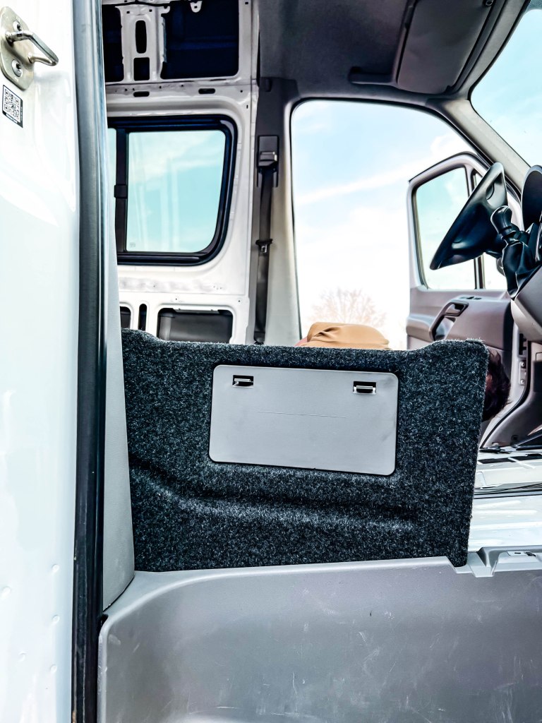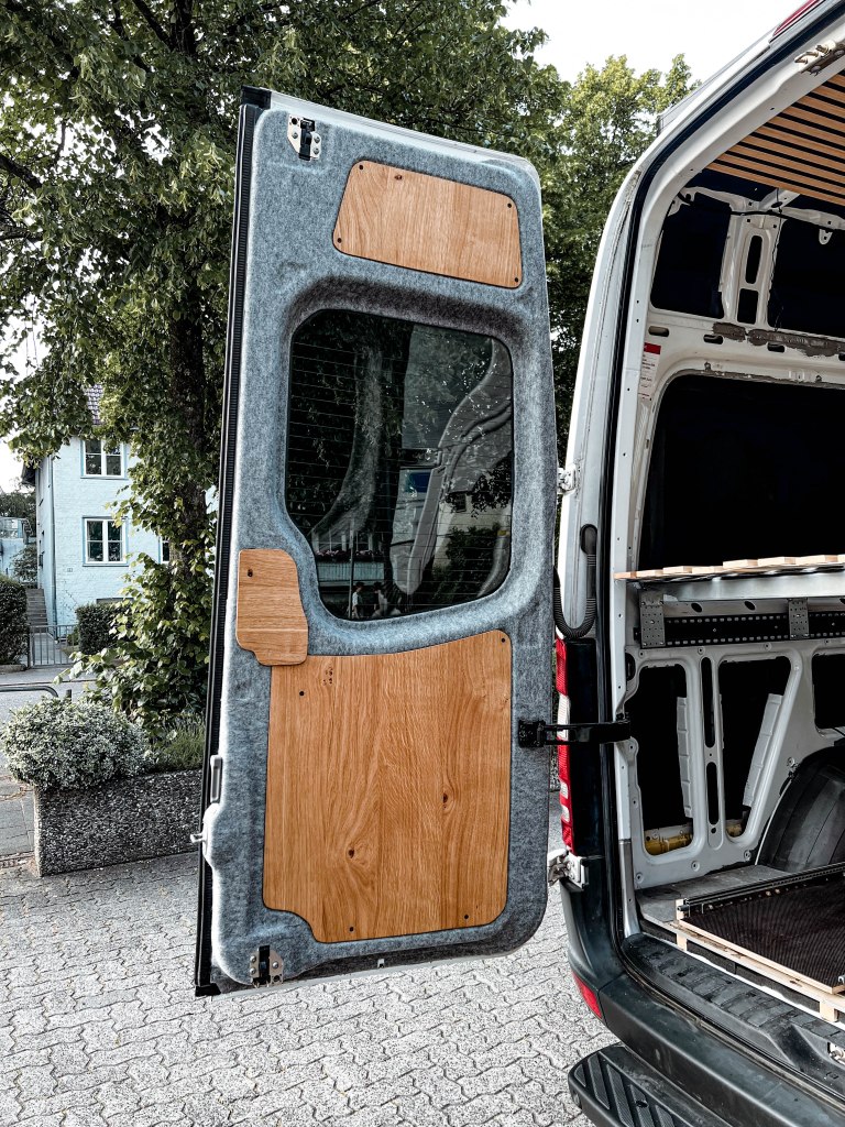 Da wir die vorher verbauten grauen Abdeckungen nicht mehr nutzen wollten und die Türen nicht einfach nur grau aussehen sollten, haben wir 5mm starke furnierte Holzplatten in der Optik Asteiche vom „Plattenladen“ vom Gründer Sven Bauhaus auf den Filz aufgebracht und sind mit dem Ergebnis wirklich sehr zufrieden. Das sogenannte Queenply Holz ist aufgrund seines geringen Gewichts super gut für den Ausbau von Campen oder Wohnmobilen geeignet und ist im Onlineshop in unterschiedlichen Stärken und Designs zu erwerben. Wir nutzen Das Queenply Holz auch für unseren restlichen Ausbau und haben damit die Hängeschränke und auch die Küche gebaut. Die Optik ist einfach wunderschön und das Gewicht wirklich unglaublich leicht.