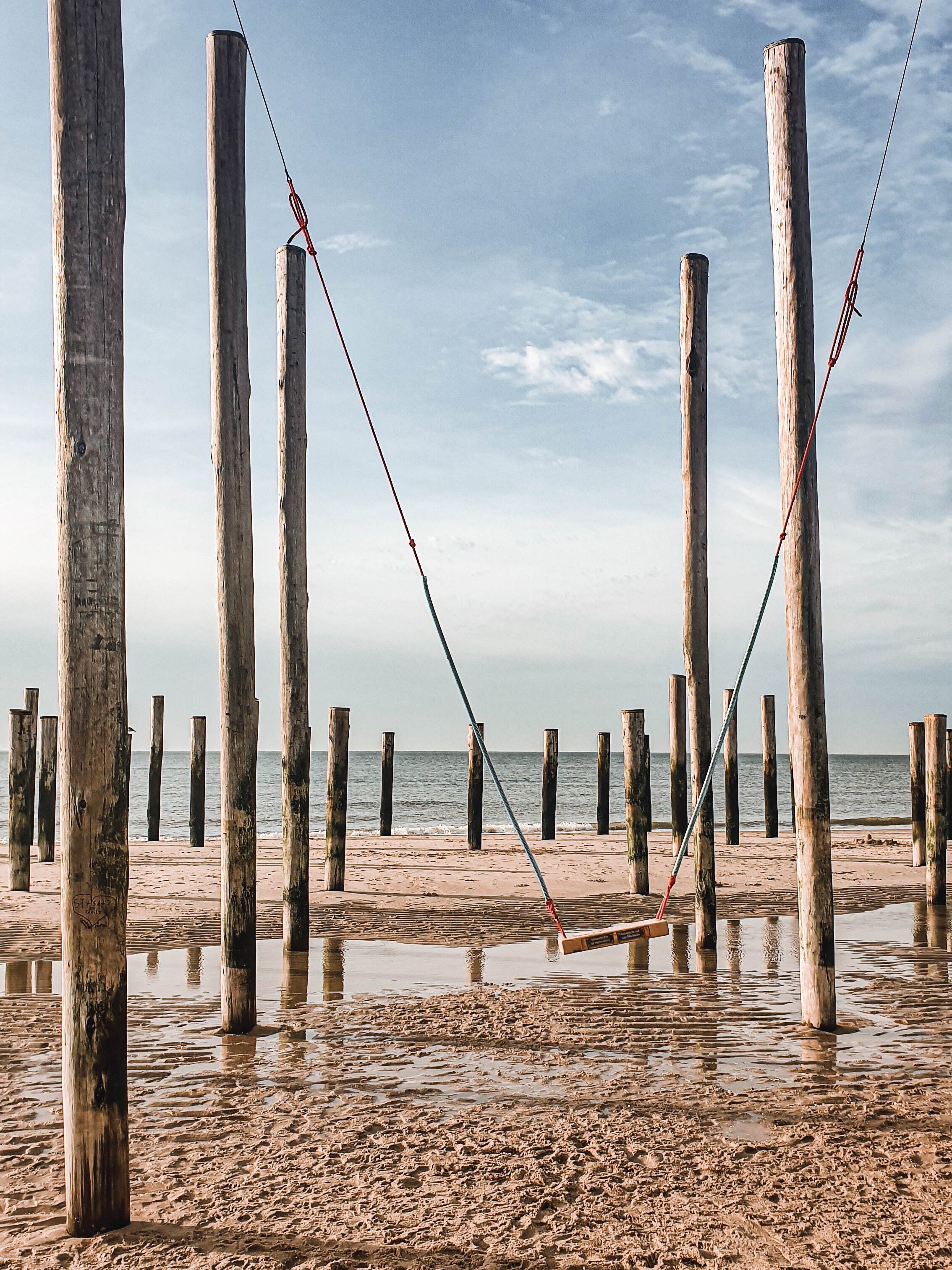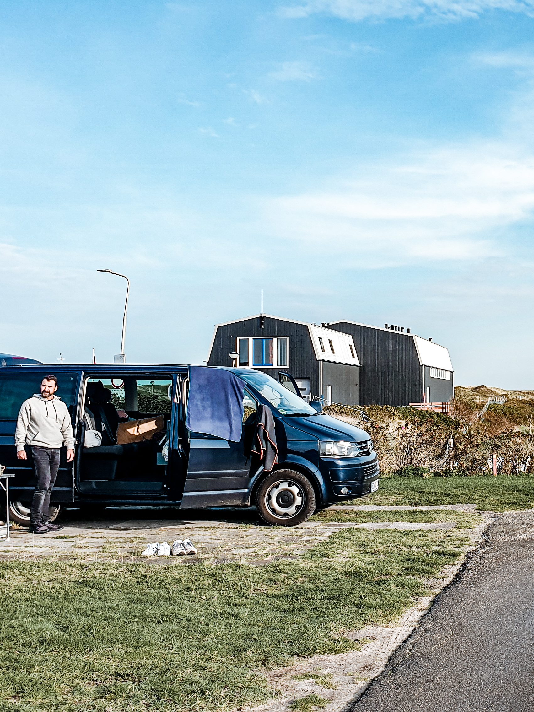 Wie so oft, buchen wir im Vorfeld keine Campingplätze und suchen uns spontan an schönen Orten (klappt mal mehr und mal wenig er gut) einen Stellplatz. Auf dieser Reise funktioniert es hervorragend. Am Anreisetag übernachten wir am späten Abend an einem Badesee kurz vor dem IJsselmeer, welches wir am kommenden Morgen überfahren. Auf dem Weg an die Strände legen wir einen spontanen Stop in Alkmaar ein – wir haben unsere French Press Kaffeekanne zu Hause vergessen und ohne Kaffee geht es einfach nicht! Also spazieren wir durch Alkmaar, besuchen den Wochenmarkt und besorgen noch die ein oder andere Kleinigkeit. Nach dem Stadtbummel fahren wir weiter nach Petten aan Zee und verbringen die zweite Nacht auf dem Campingplatz „Camping Corfwater“. Der Campingplatz schließt Ende Oktober, sodass kaum noch Besucher da sind und wir uns ganz entspannt einen Stellplatz aussuchen, die Ruhe mit direkter Nähe zum wirklich wunderschönen Strand genießen können und uns direkt nach der Ankunft an den traumhaft schönen Strand begeben. Überall im Sand stecken meterhohe Dalben und zwischen zwei Dalben hängt eine Schaukel, die natürlich auch von uns getestet wird. Nach einem schönen Nachmittag am Meer, kochen wir am Abend am Bulli, sitzen draußen bis es kalt wird und lassen den Abend gemütlich ausklingen.