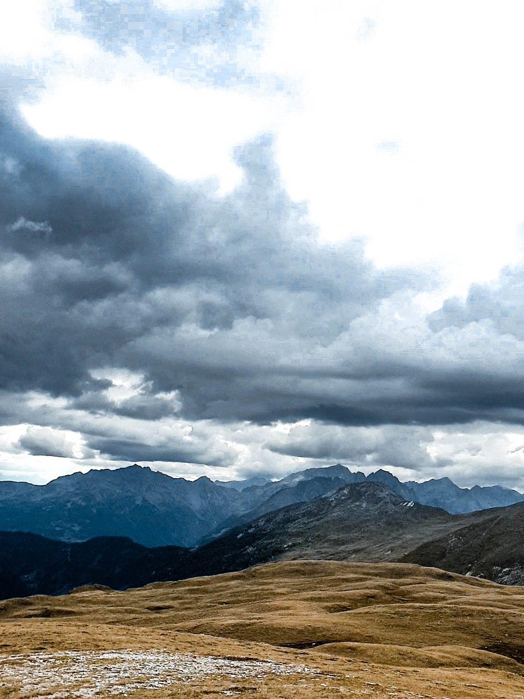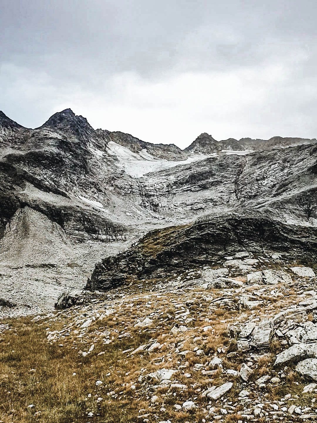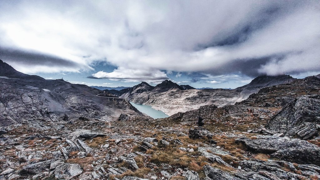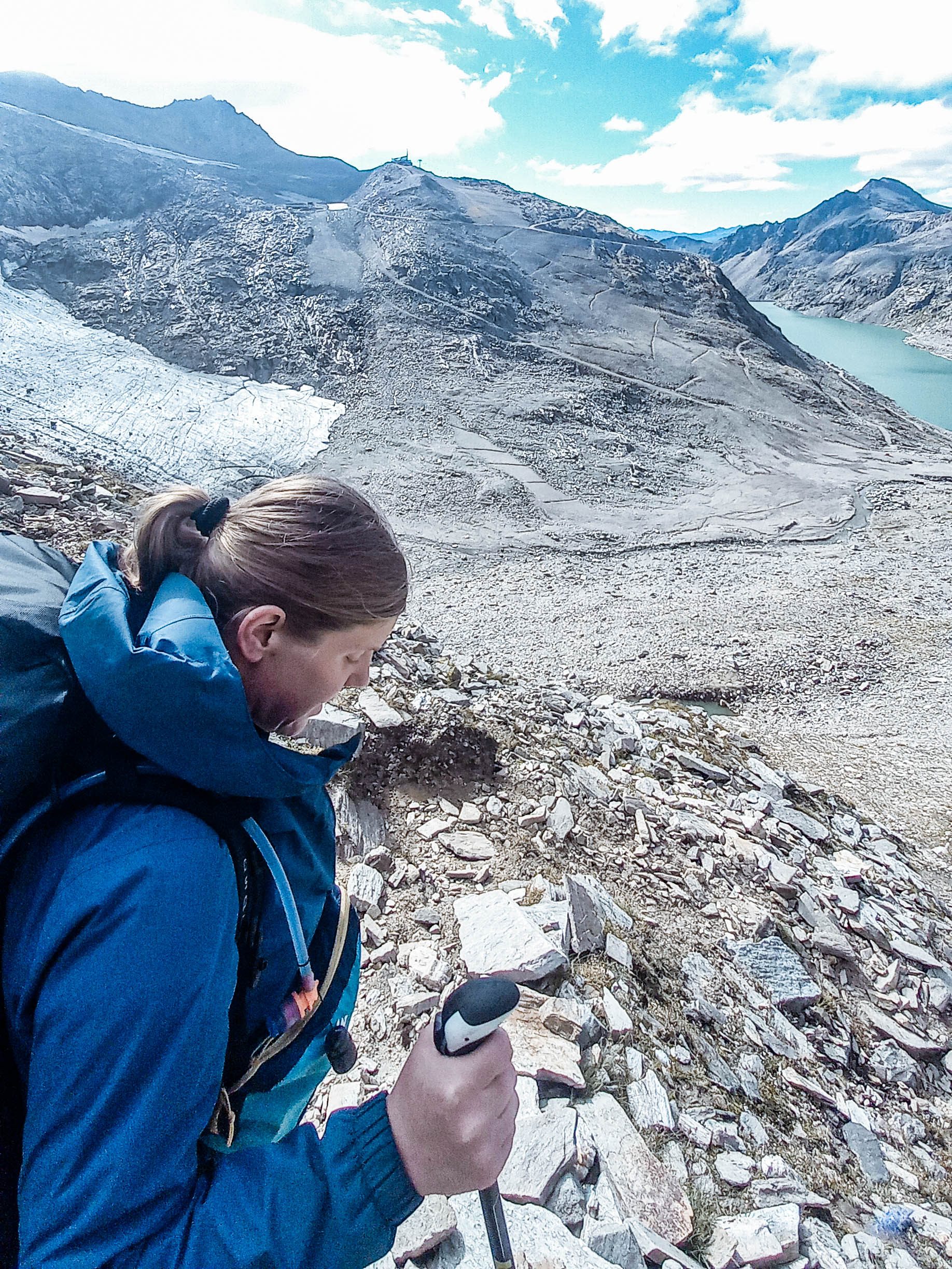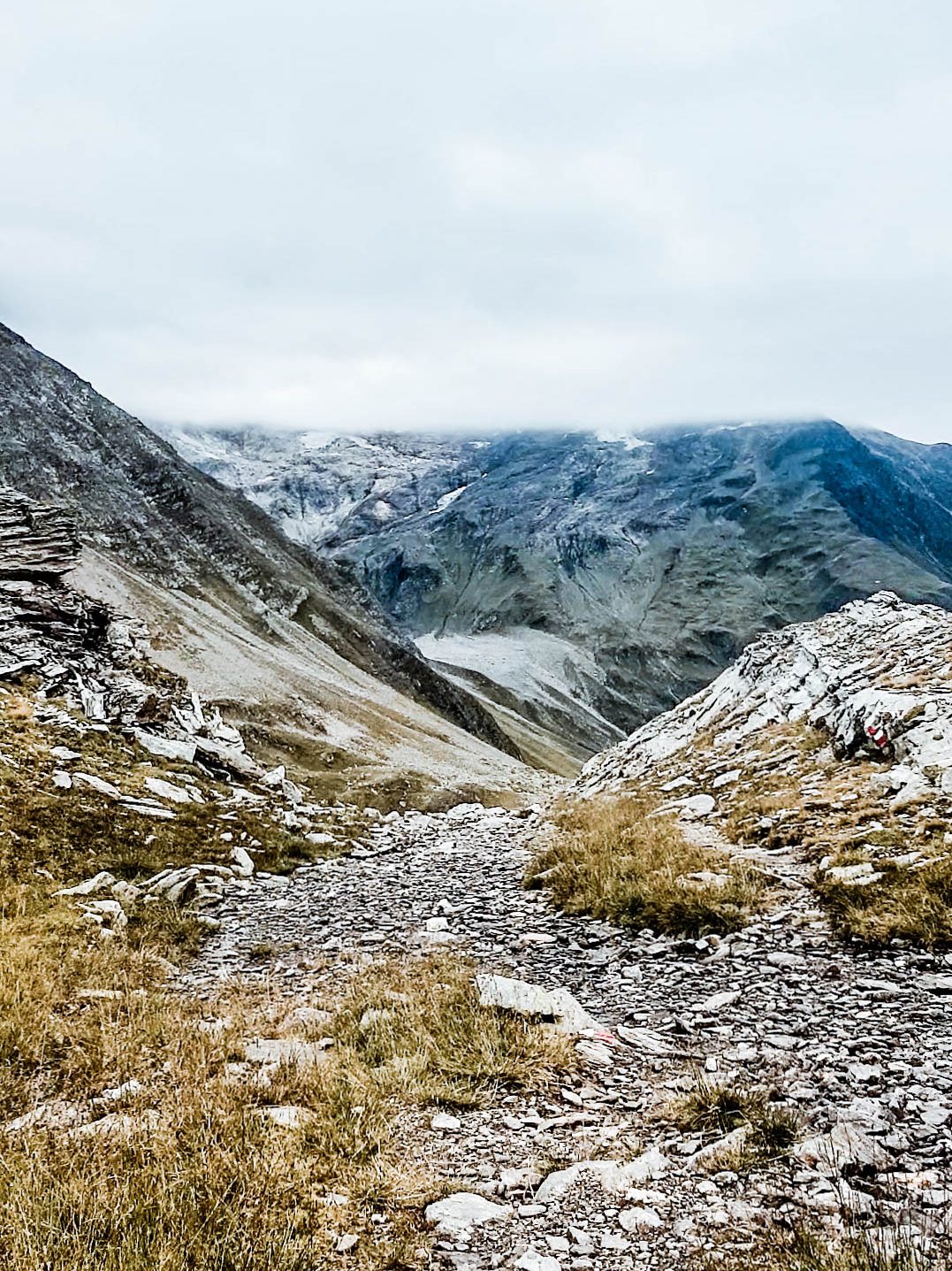 Die Fraganter Scharte befindet sich mitten auf dem Alpenhauptkamm zwischen Salzburg und Kärnten. Oben angekommen, pfeift uns ordentlich der Wind ins Gesicht und es ist ziemlich kalt. Wir verweilen daher nur kurz und machen uns schnell wieder auf den Weg, der uns nun leider durch ein, in dieser Jahreszeit schneefreies, Skigebiet am Mölltaler Gletscher führt. Der Anblick der planierten Berge und der errichteten Ski-Infrastruktur mitten in der Natur ist ehrlich gesagt ein absoluter Graus. So sehr ich auch verstehen kann, dass Wintersport Spaß macht, ist der Eingriff in den Naturraum und die damit verbundene Umweltzerstörung wirklich enorm und stimmt uns nachdenklich.