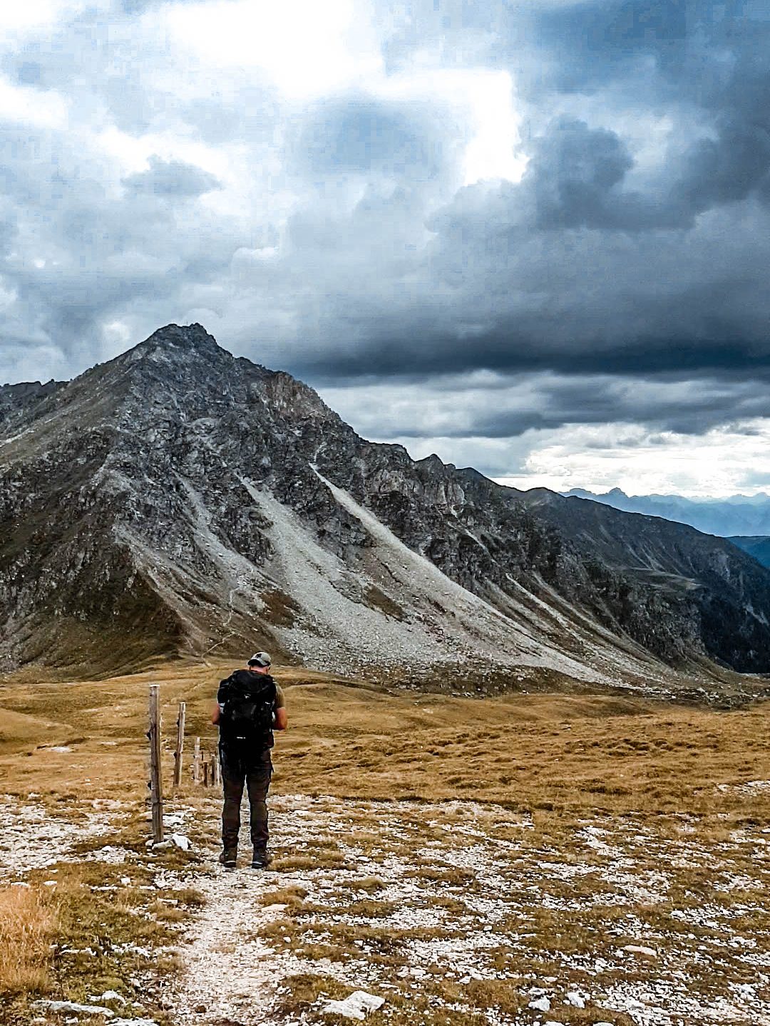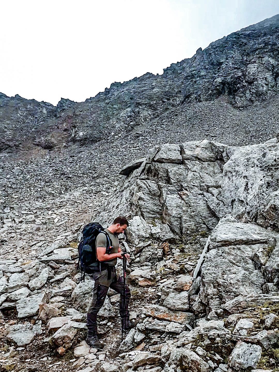 Nach dem Frühstück starten wir die Etappe in Richtung Fraganter Schutzhaus. Die Strecke bietet nicht nur atemberaubende Ausblicke, sondern auch eine wunderbare Gelegenheit, die Natur zu genießen. Wir steigen also entlang der Überbleibsel der alten Bremsbahn an der Westseite der Herzog-Ernst-Spitze zur Fraganter Scharte auf und sind erneut völlig sprachlos über die Schönheit der Berge. Die Landschaft ändert sich jeden Tag mehrmals, die Weite raubt einem stellenweise den Atem und uns wird immer wieder bewusst, wie klein wir Menschen doch in dieser rauen Welt aus Felsen sind und was wir leisten müssen, um uns in den Bergen zu fortzubewegen.
