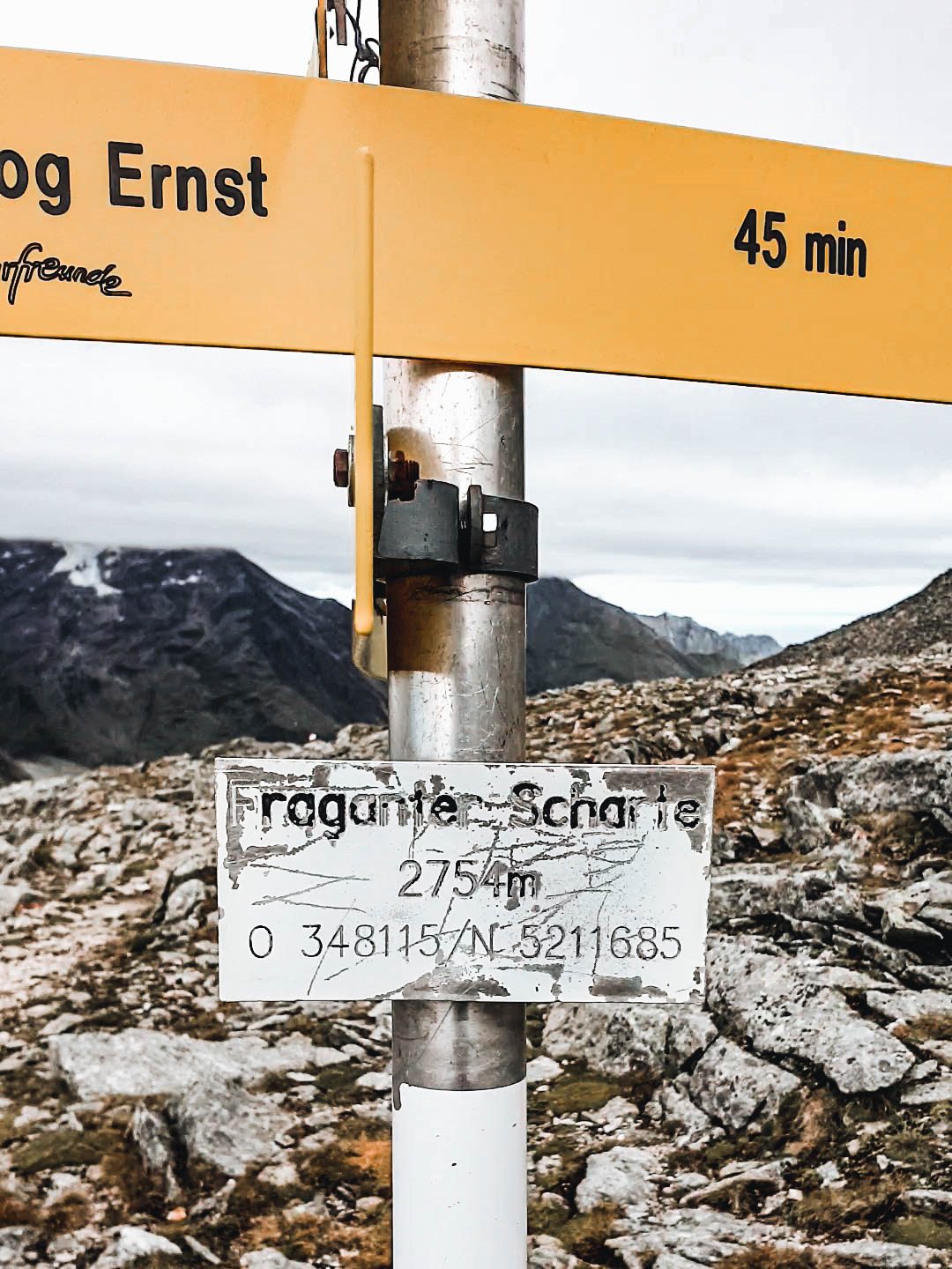 Wegweiser auf dem Weg zur Fraganter Scharte im Stein