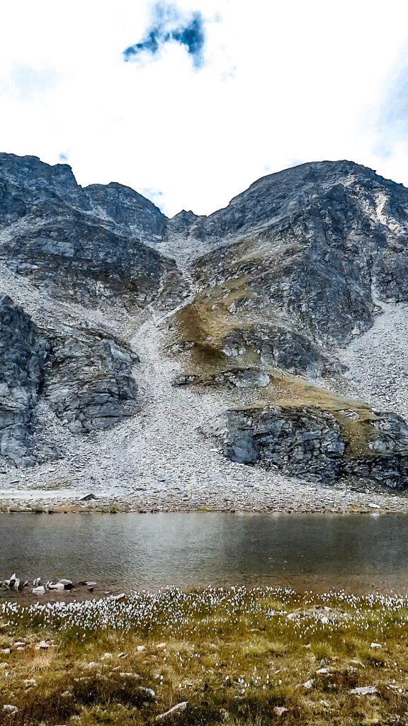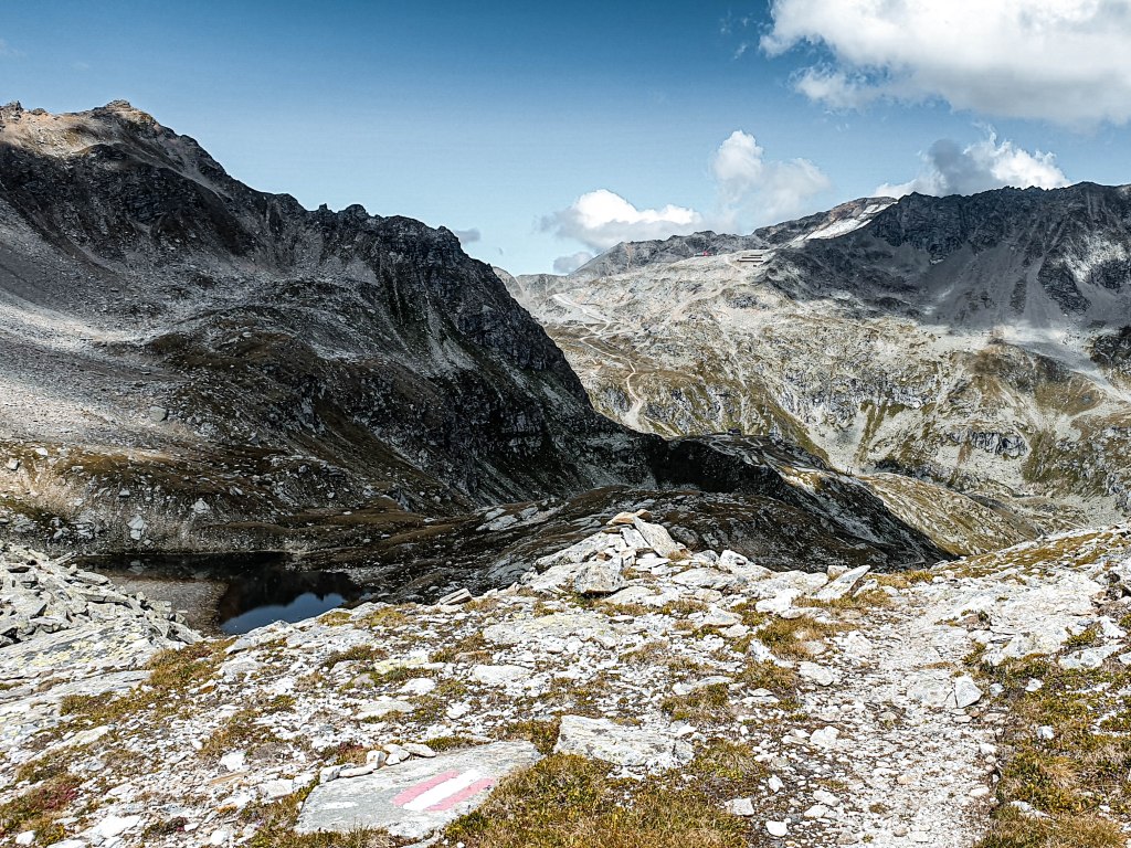 Für uns geht es nun am Schwarzsee vorbei, von wo wir den nächsten Aufstieg zur Saustellscharte auf 2.560m beginnen. Unten am See ist es traumhaft schön. Der Aufstieg sieht von unten viel schwieriger aus als er letztlich ist (die schlimmere Stelle kommt noch, bleibt gespannt…). Oben an der Scharte angekommen, machen wir eine längere Pause und genießen die Sonne und den Ausblick in das Tal.